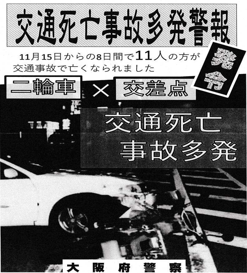 現在大阪府では交通死亡事故が多発しており、交通死亡事故多発警報が発令されました。